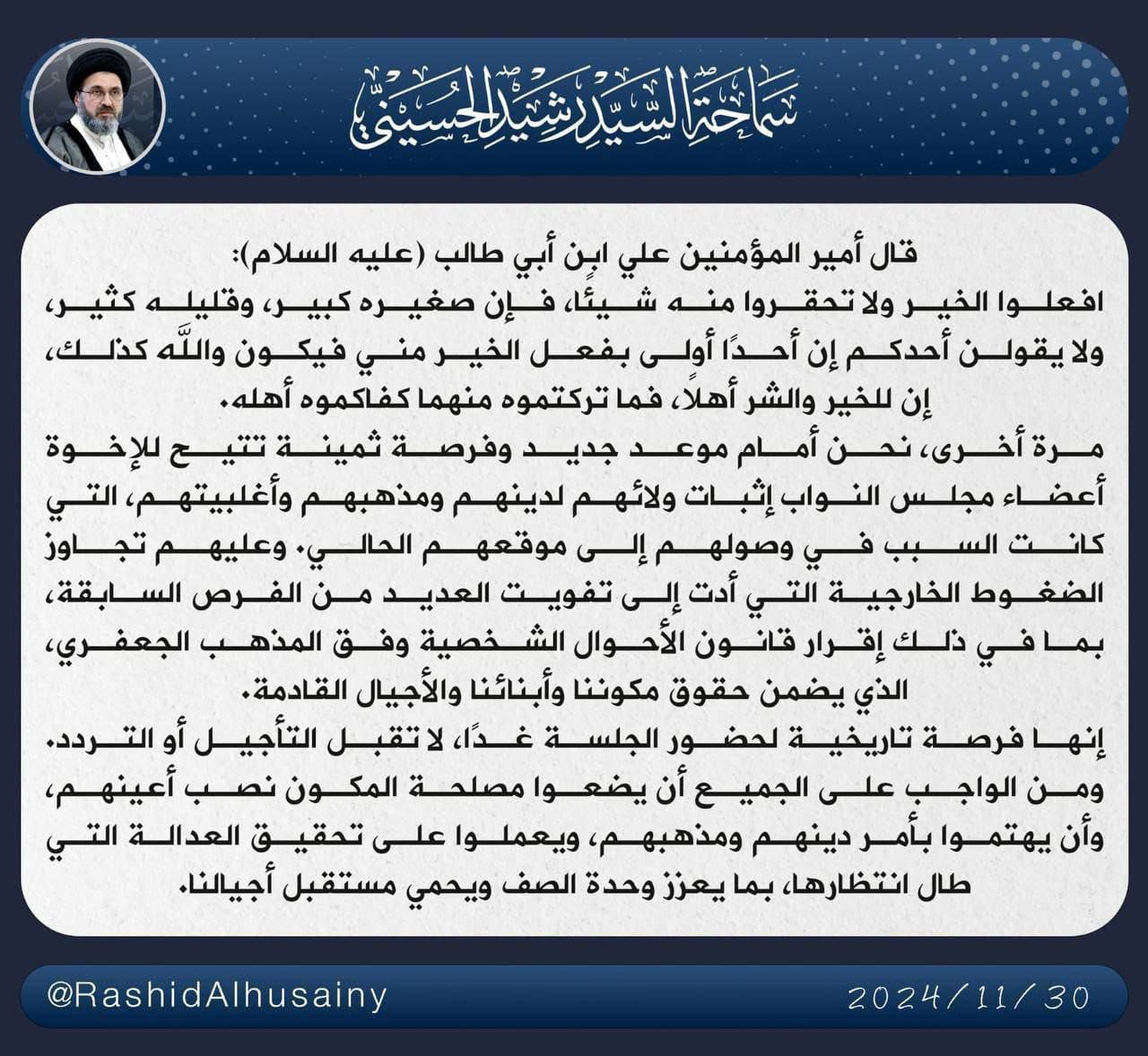 وقال الحسيني في تدوينة له على حسابه الشخصي في منصة (إكس) وتابعها (كلمة) الإخباري: إن "أمام أعضاء مجلس النواب فرصة ثمينة تتيح لهم إثبات ولائهم ومذهبهم وأغلبيتهم، التي كانت السبب في وصولهم إلى موقعهم الحالي".
