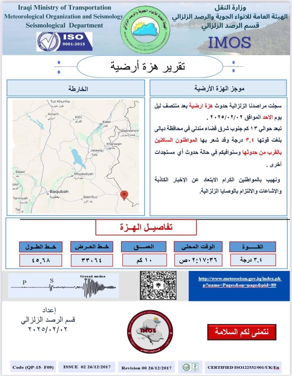 اعلنت الهيئة العامة للانواء الجوية والرصد الزلزالي ، صباح اليوم الأحد، تسجيل هزة ارضية في قضاء مندلي التابعة لمحافظة ديالى.