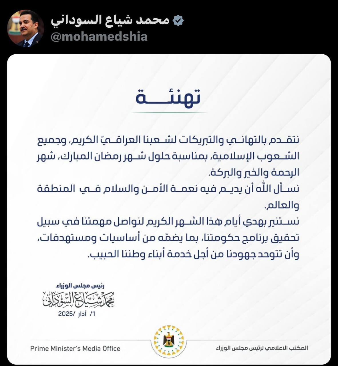 وقال السوداني في بيان التهنئة واطلع عليه كلمة الإخباري: "نستنير بهدي أيام هذا الشهر الكريم لنواصل مهمتنا في سبيل تحقيق برنامجنا الحكومي..".