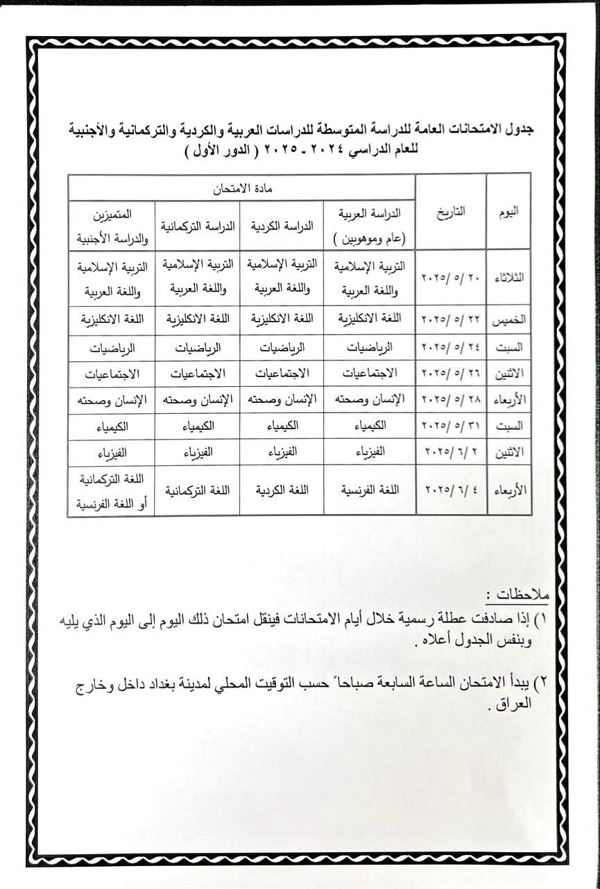 أما امتحانات مرحلة الثالث المتوسط فتبدأ بتاريخ (20 – 5 – 2025) وتنتهي بتاريخ (4 – 6 – 2025).