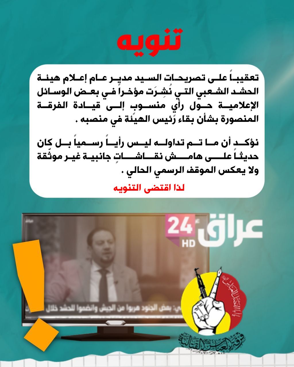 وذكرت الفرقة في تنويه لها تلقاه كلمة الإخباري: "تعقيباً على تصريحات مدير عام إعلام الحشد الشعبي التي نُشرت مؤخراً في بعض الوسائل الإعلامية حول رأي منسوب إلى قيادة الفرقة (المنصورة) بشأن بقاء رئيس الهيئة في منصبه ليس رأياً رسمياً".