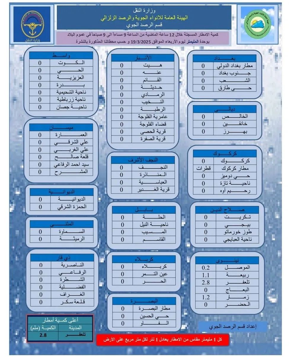 وبحسب بيانات قسم الرصد الجوي التابع للهيئة التي حصل عليها كلمة الإخباري، فإن قضاء تلعفر في محافظة نينوى سجل أعلى معدل للأمطار بلغ 2.8 ملم خلال الفترة الممتدة من الساعة التاسعة مساء أمس وحتى التاسعة صباح اليوم الأربعاء الموافق 19 آذار 2025.