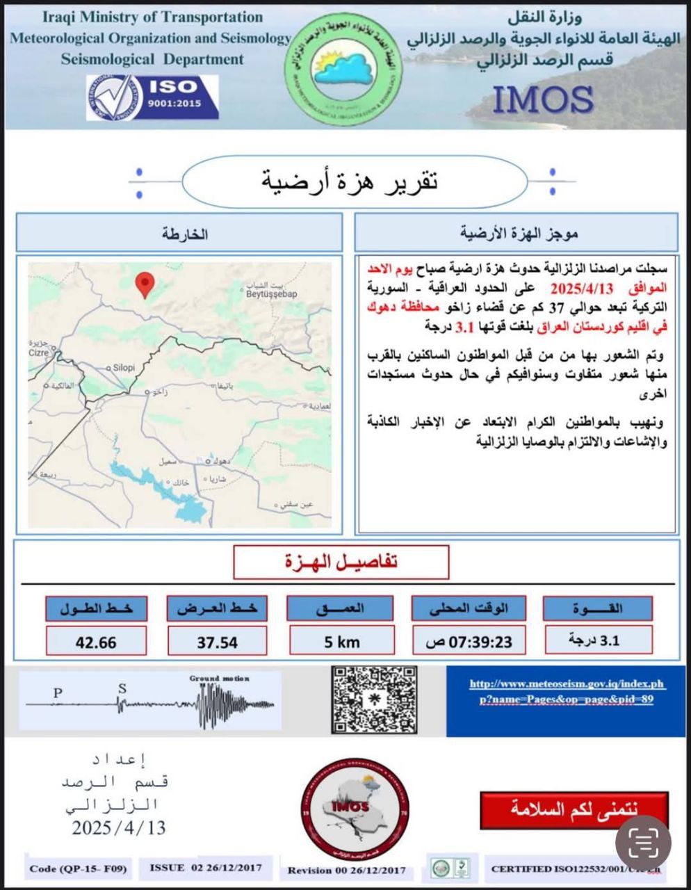 وذكرت الهيئة في بيان تلقاه كلمة الإخباري، أن المراصد الزلزالية رصدت الهزة في صباح اليوم، مبينة أنها تبعد حوالي 37 كيلومترًا عن قضاء زاخو في إقليم كردستان.