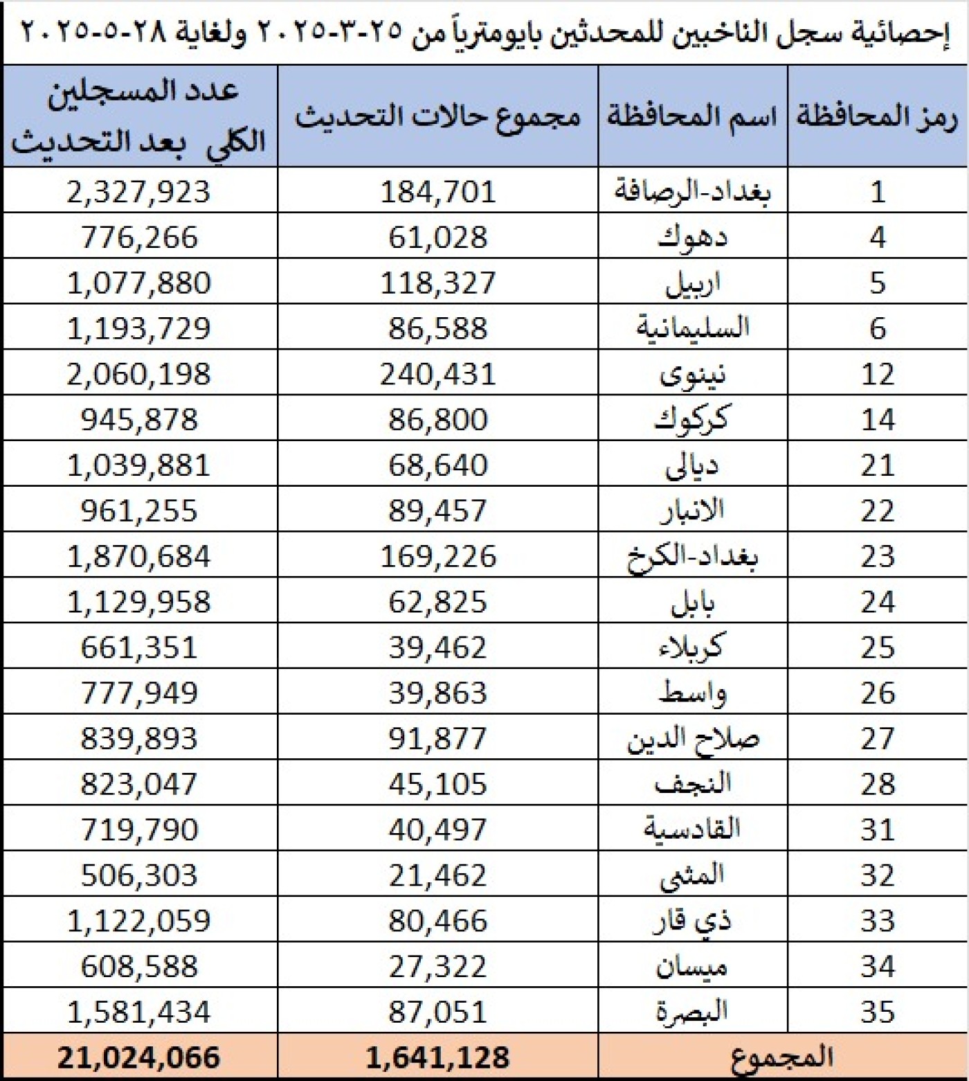 وفي إحصائية نشرتها المفوضية، حصل عليها كلمة الإخباري، "غطت الفترة من 25 آذار 2025 لغاية 28 أيار 2025، بلغ عدد الذين قاموا بتحديث بياناتهم بايومترياً مليون و641 ألف و128 شخصاً، العدد الأكبر منهم كانوا في بغداد (353927)/ الرصافة (184701) والكرخ (169226)، بعدها محافظة نينوى (240431)، ثم أربيل (118327) فرداً".