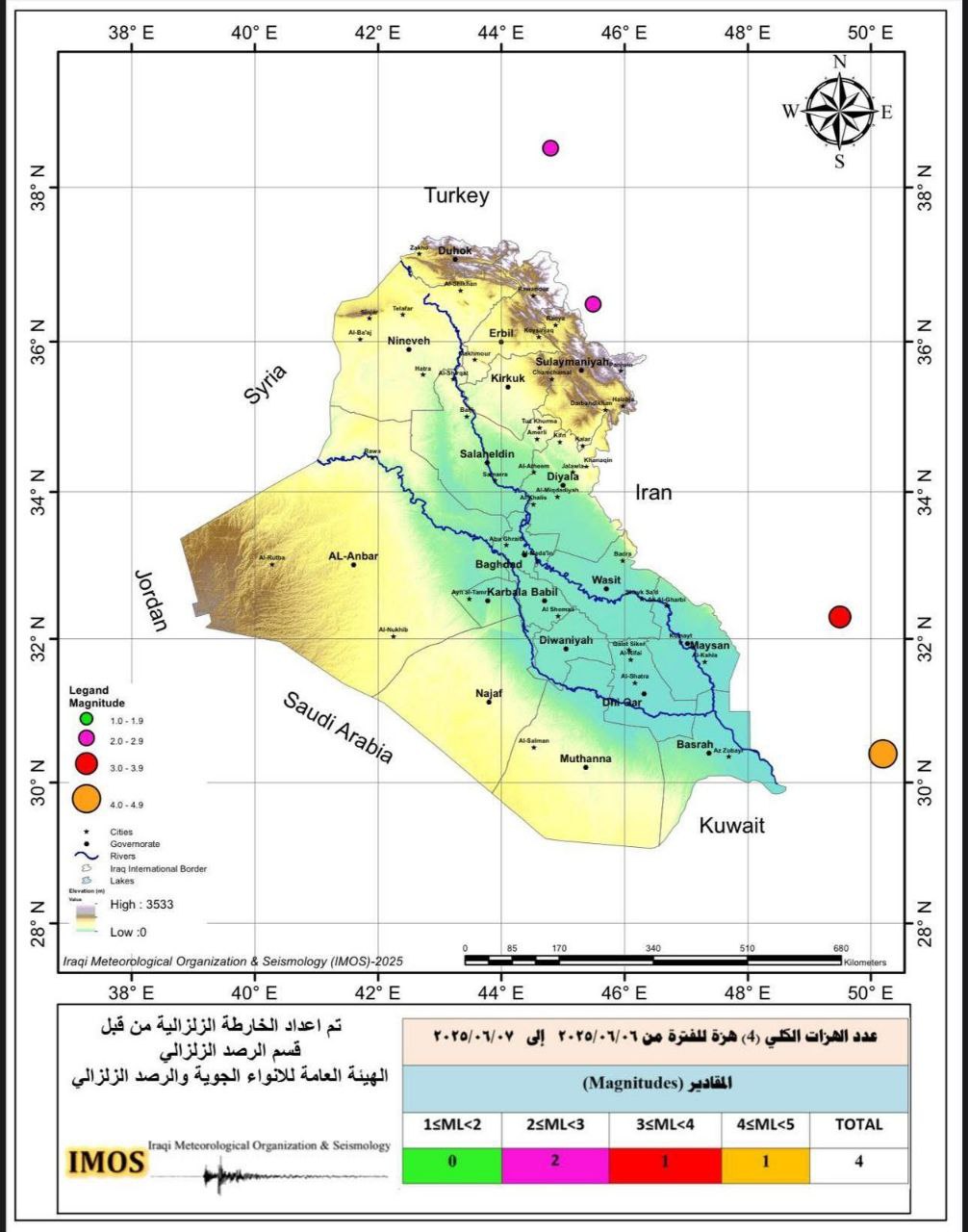 أعلن قسم الرصد الزلزالي في الهيئة العامة للأنواء الجوية العراقية، اليوم السبت، عن تسجيل 4 هزات أرضية على طول الحدود العراقية الإيرانية.
