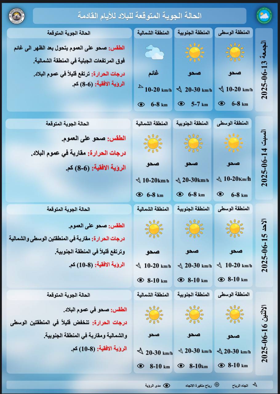وأوضحت الهيئة أن "الرياح ستكون خفيفة إلى معتدلة السرعة، متغيرة الاتجاه، وتتراوح سرعتها بين 5 إلى 15 كم/ساعة، مع تحولها أحياناً إلى شمالية شرقية معتدلة بسرعة تتراوح بين 10 إلى 20 كم/ساعة في الأجزاء الشرقية".