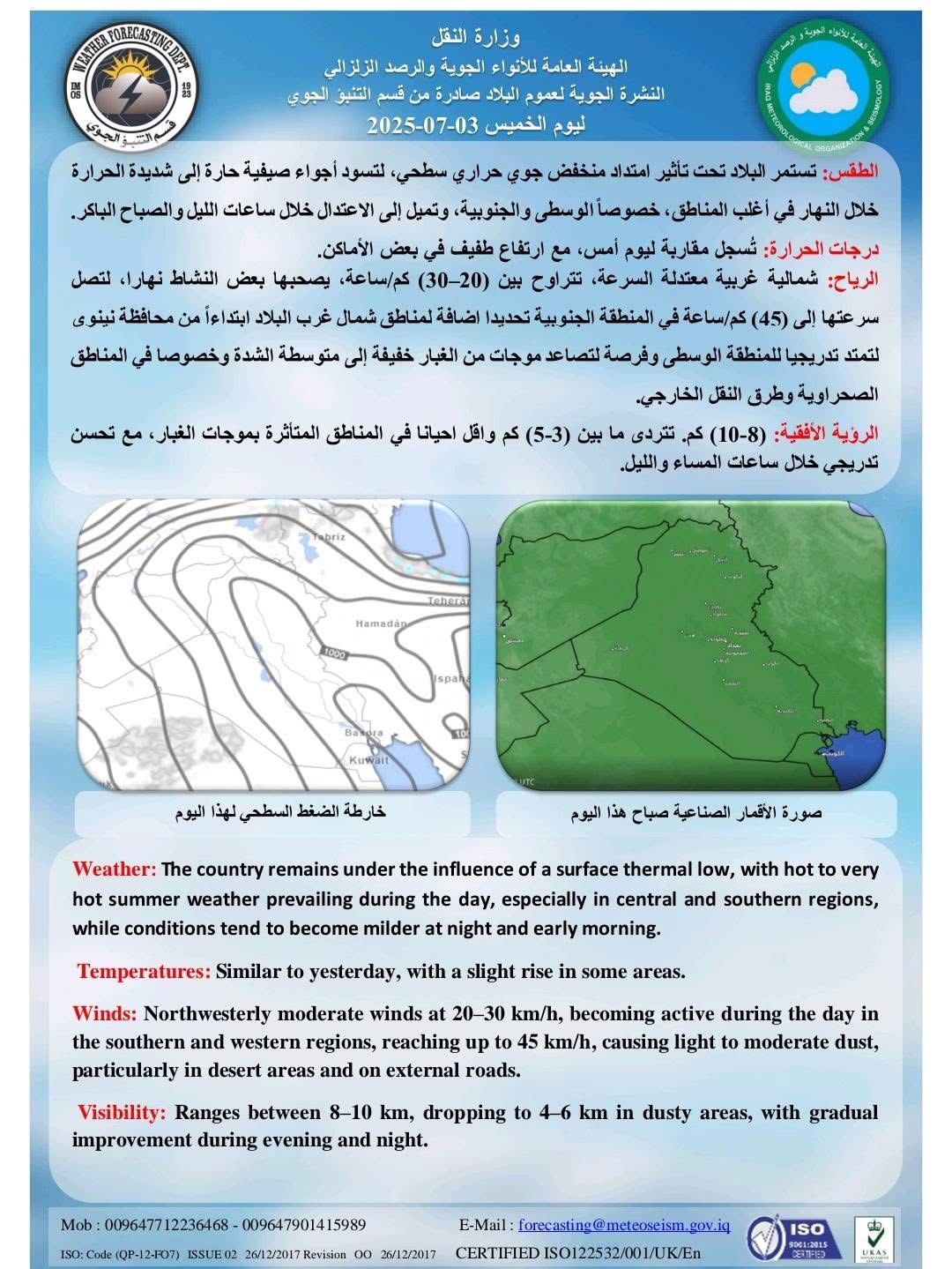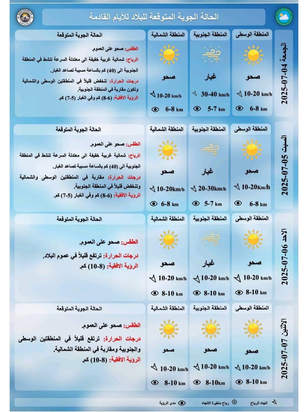 وتوقعت الهيئة أن "هبوب رياح شمالية غربية معتدلة السرعة، تتراوح بين (20-30) كم / ساعة، يصحبها بعض النشاط نهارا، لتصل سرعتها إلى (45) كم / ساعة في المنطقة الجنوبية تحديدا اضافة لمناطق شمال غرب البلاد ابتداءاً من محافظة نينوى لتمتد تدريجيا للمنطقة الوسطى وفرصة لتصاعد موجات من الغبار خفيفة إلى متوسطة الشدة وخصوصا في المناطق الصحراوية وطرق النقل الخارجي".